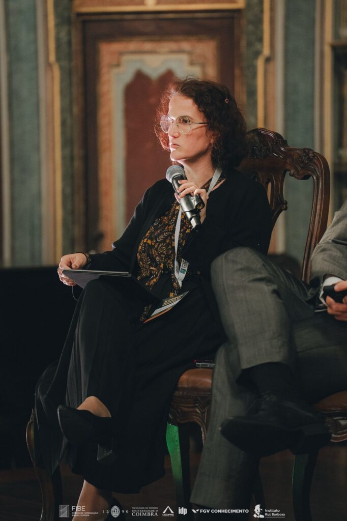 Matilde Lavouras, professora da Faculdade de Direito da Universidade de Coimbra, abriu o painel partilhando um pouco daquilo que é a sua investigação académica,  centrando parte da sua fala no universo dos criptoativos. Destacou que, nos últimos anos, assistimos ao surgimento de novas formas de pagamento e à expansão de intermediários financeiros em ambientes marcados pela descentralização e pela criação de moedas privadas, um movimento que desafia diretamente o tradicional monopólio da moeda.